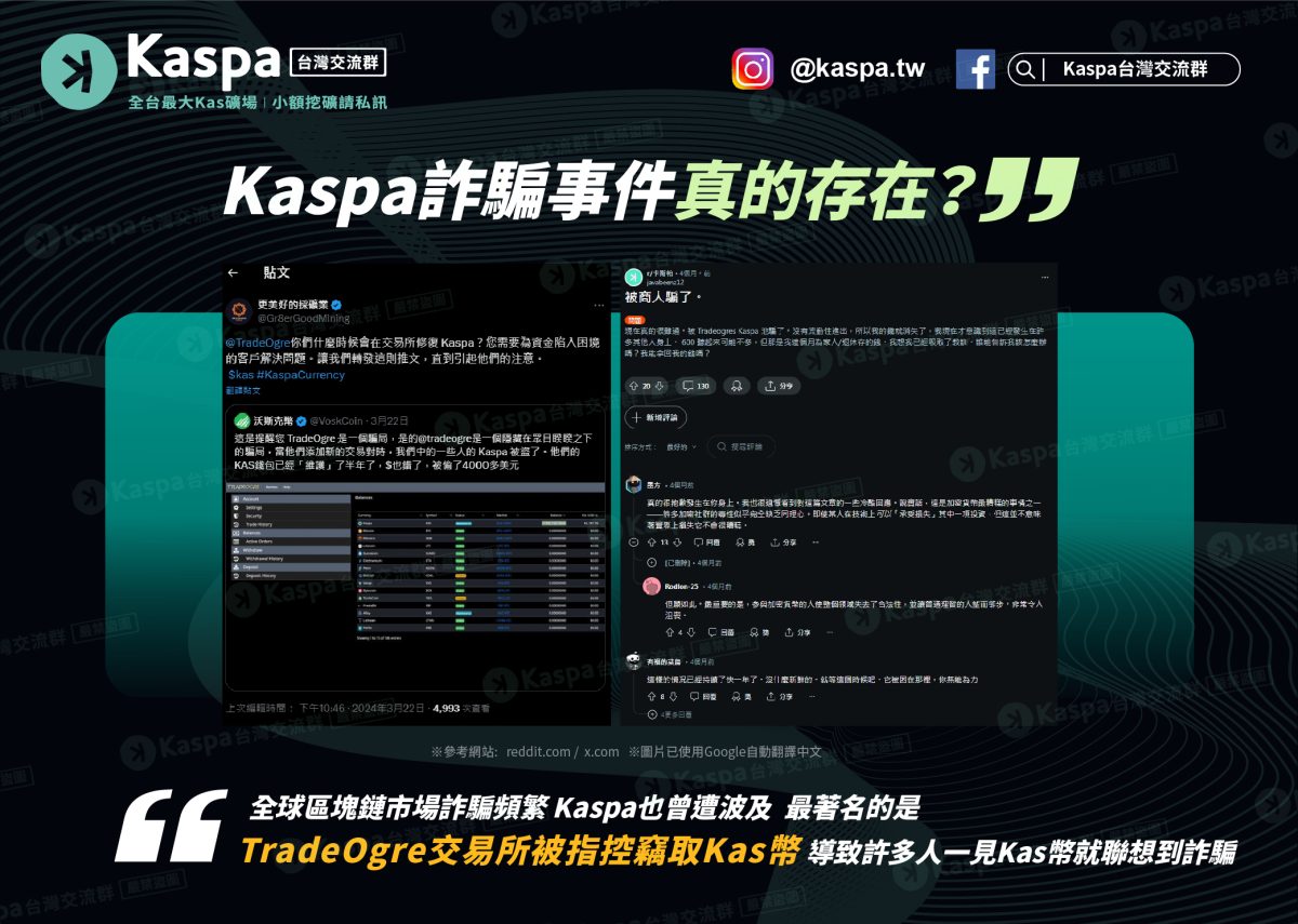 放眼全世界區塊鏈市場,關於區塊鏈詐騙事件真的很多,連Kaspa也曾發生多起詐騙事件,最著名的莫過於Kaspa持有者指控TradeOgre交易所竊取Kas幣,以及多起詐騙虛擬貨幣交易平台販售Kas幣來誆騙受害人,導致不少投資人只要看到有平台販售Kas幣,就直接把它歸類為詐騙,使得Kaspa區塊鏈無緣無故成為詐騙受害者,而這都跟Kaspa一夕爆紅有關。